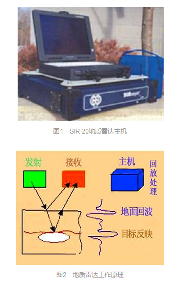 雷達檢測車以一定速度在路面上行駛,路面探測雷達發射電磁脈沖并在短時間內穿過路面,脈沖反射波被無線接收機接收,數據采集系統記錄返回時間和路面結構中的不連續電介質常數的突變情況。路面各結構層材料的電介質常數明顯不同,因此電介質常數突變處也就是兩結構層的界面。根據測知的各種路面材料的電介質常數及波速,可計算路面各結構層的厚度或給出含水量、損壞位置等資料。圖1為SIR-20地質雷達主機,圖2為地質雷達工作原理。