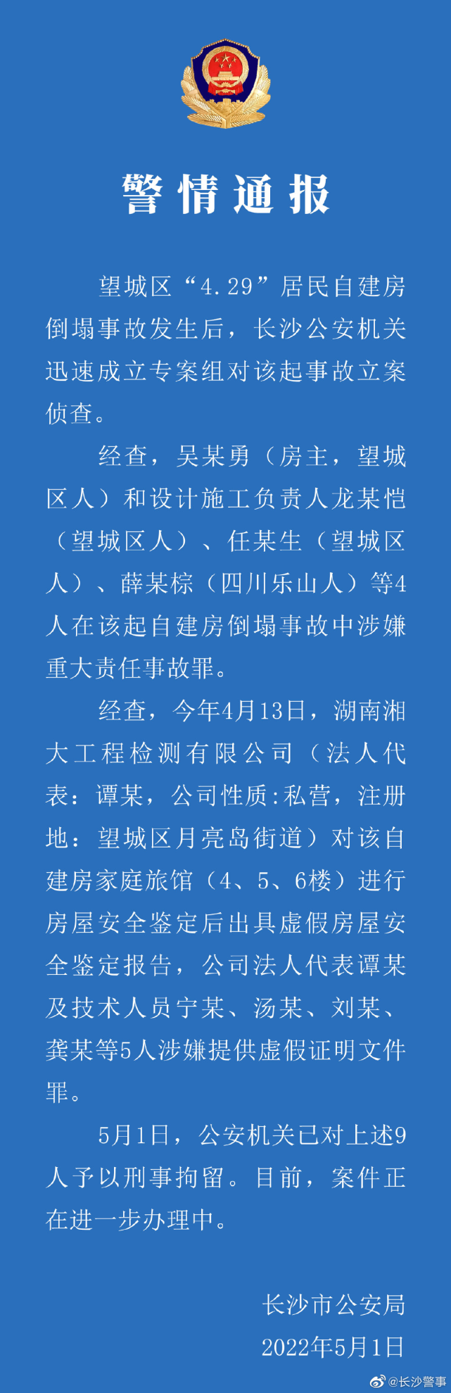 5月1日,@長沙警事 通報長沙自建房倒塌事故:共9人被刑拘。